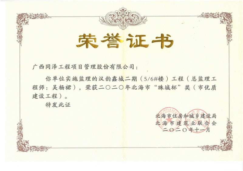 漢韻鑫城5#、6#樓榮獲2020年北海市“珠城杯獎”(市優質建設工程)