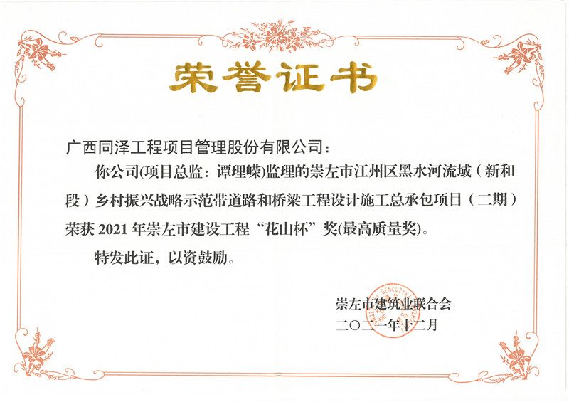 崇左市江州區黑水河流域(新和段)鄉村振興戰略示范帶道路和橋梁工程設計施工總承包項目(二期)項目榮獲2021年崇左市建設工程“花山杯”獎(最高質量獎)